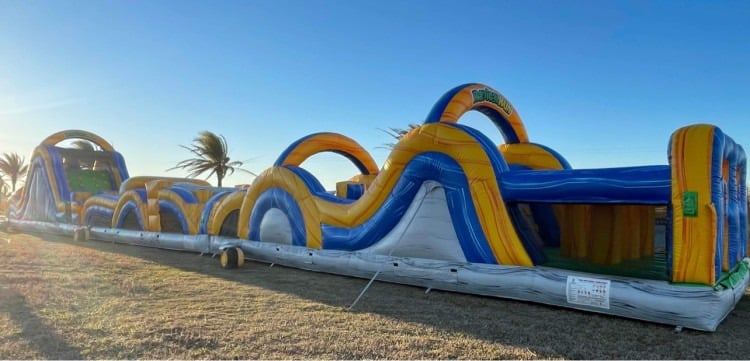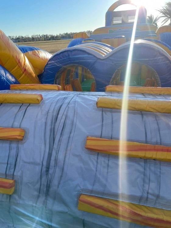 Get ready to race your best friend through the long lasting 100’ Radical Run Mega Marble. Don’t miss a beat as you jump over obstacles, climb walls and slide into more obstacles before you reach the 12’ climbing wall. Once you’ve gotten over your fear of heights, you’re ready to slide down the 16’ double lane slide!
