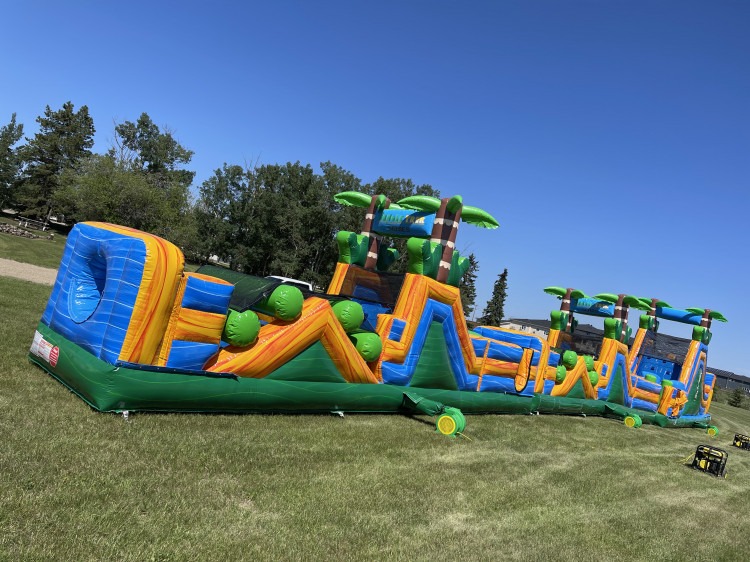 #90 110’ Tropical Adrenaline Obstacle Course is one of the greatest obstacle course you’ll see all day. With its massive size and amazing and unique colours and tons of obstacles and a massive 12’ climbing wall and a super crazy double lane 17’ slide!!