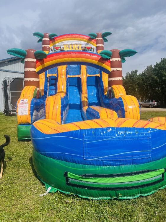 Bring the tropical vibes to your next event with our 20-foot Dual Lane Tiki Slide! This vibrant, island-inspired inflatable slide features a fun tiki theme, complete with bright colors, palm trees, and a tropical design that will transport your guests straight to paradise. At 20 feet tall, this slide offers an exhilarating ride as guests race down the two side-by-side lanes, adding an extra level of excitement to any gathering.
