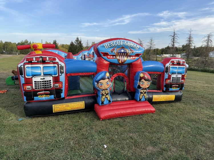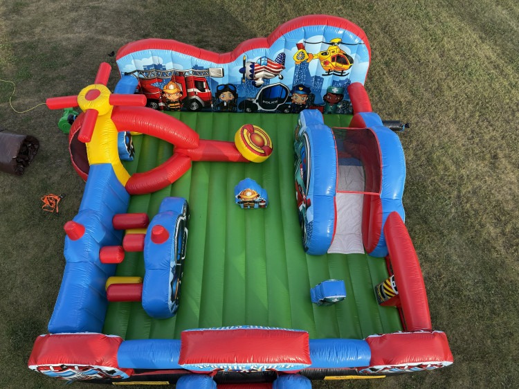 The Rescue Squad is an amazing inflatable toddler playground for little heroes and heroines. This inflatable game has a rescue worker theme, including depictions of police, fire and emergency service workers and their vehicles. This unique inflatable playground features a fun three-dimensional ambulance climb and slide, a 3-D police cruiser with pop up obstacles and adorable 3-D fireman and nurse pop ups. An oversized rescue helicopter completes this detailed rescue worker theme, along with rescue-themed artwork on both the interior and exterior walls. This large inflatable game for toddlers can be an ideal centerpiece for a Family Entertainment Center, Indoor Playground or a backyard party. The inflatable play structure takes participants up a climb and down a slide and past pop-ups to facilitate maneuvering skills and build confidence. The rescue worker-themed inflatable play structure guarantees hours of enjoyable physical activity, and offers an opportunity for little ones to learn about community rescue workers. Each game has mesh windows for easy viewing, and is constructed of the fire-resistant, lite n' strong™ vinyl for easy portability, durability and safety, and comes with all the necessary accessories for an easy set up and take down.