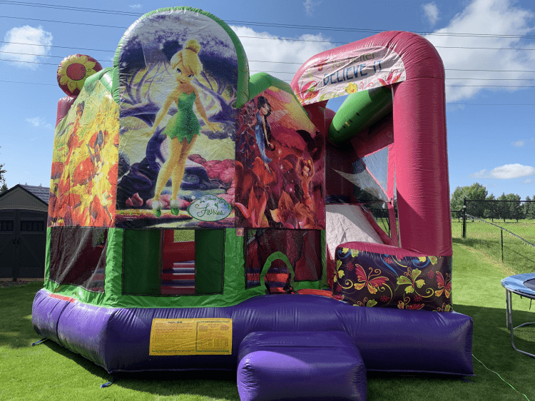 You’re about to enter Tinker bell’s world as you climb into the #20 Disney Tinkerbell Combo. You will have to crawl through a tunnel before you can access all the fun this 20 square foot world has to offer. Once you’re in, you’ll have a chance to fly over all the obstacles that tinkerbell need to get over to achieve success. If you need a break, practice your basketball tricks for a few minutes then run to the 9’ climbing wall to get to the last step of the tinkerbell experience by sliding down the fun and tall 12’ slide! You’re welcome to at it again or come off and give a chance to your pal.