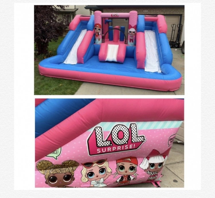 #34 LOL girly combo is known for its beautiful colours and its double slides. this unique is the perfect combination for a backyard birthday party where you have tighter space to work with. this 15'x15' bouncy castle combo is a sure hit for any birthday party! it also comes with obstacles as well as a 7'x7' bouncing area and a basketball hoop!